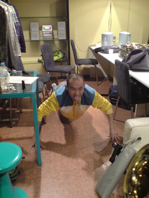 ↓楽屋で気合注入中の田中慶一氏(dr)。